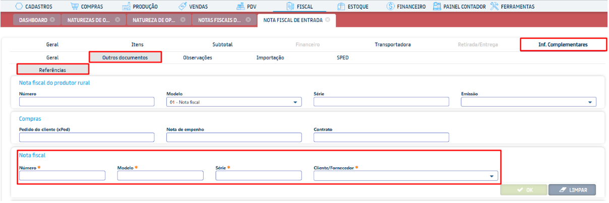 4- Referenciar a chave de acesso da NF-e que será estornada nas informações complementares → Outros documentos:
