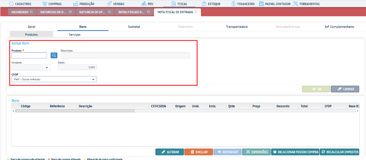 Permite a digitação de produtos na nota fiscal: marque esta opção caso deseje que os produtos sejam digitados na nota de estorno;